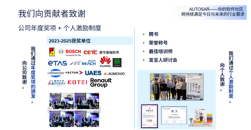 AUTOSAR中国社区肩负着将中国汽车产业的声音与需求传递至全球标准舞台的使命。为此,社区多措并举,积极引导和支持中国伙伴参与国际标准制定。从2023年开始,社区便推进“中国工作推进组”项目,通过招募标准制定导师,为有意参与的企业提供流程指导与支持。社区通过组织在线分享、线下研讨会等形式,邀请特定工作组的专家介绍工作流、分享经验,并开展“导师走进合作伙伴”活动,进行面对面的申请流程辅导。更重要的是,社区成功推动了数个源自中国的新标准概念组的成立。截至目前,已有三个由中国提出的标准工作组概念被AUTOSAR组织接受,涵盖了操作系统抽象、虚拟机管理以及进程间通信等关键领域,为全球标准贡献了中国智慧。