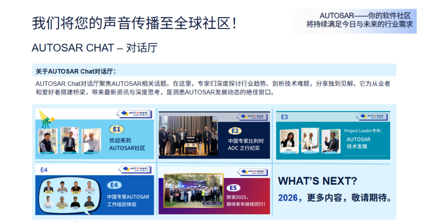 为了更生动地记录与传播中国伙伴的见解,社区于2025年推出了“AUTOSAR Chat对话厅”视频内容系列。该系列聚焦AUTOSAR相关话题,邀请专家深度探讨行业趋势与技术见解。这些内容不仅在中国本土平台发布,也被同步至领英、YouTube等全球社交媒体及AUTOSAR官网,有效将中国产业界的思想与实践传播至全球社区,提升了中国声音在国际舞台上的能见度与影响力。